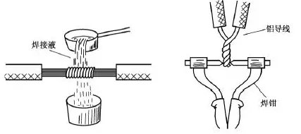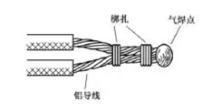 氣焊是指利用氣焊槍的高溫火焰,將鋁芯線的連接點(diǎn)加熱,使待連接的鋁芯線相互熔融連接。氣焊前應(yīng)將待連接的鋁芯線絞合,或用鋁絲或鐵絲綁扎固定,如圖19所示。
