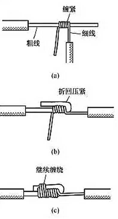不同截面單股銅導(dǎo)線連接方法如圖3所示,先將細(xì)導(dǎo)線的芯線在粗導(dǎo)線的芯線上緊密纏繞 5~6圈,然后將粗導(dǎo)線芯線的線頭折回緊壓在纏繞層上,再用細(xì)導(dǎo)線芯線在其上繼續(xù)纏繞3~4圈后剪去多余線頭即可。