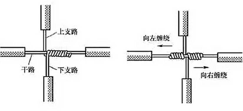 單股銅導(dǎo)線的十字分支連接如圖5所示,將上下支路芯線的線頭緊密纏繞在干路芯線上5~8圈后剪去多余線頭即可。可以將上下支路芯線的線頭向一個方向纏繞[見圖5(a)],也可以向左右兩個方向纏繞[見圖 5(b)]。