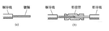另一種方法是將銅導(dǎo)線鍍錫后采用鋁套管連接。由于錫與鋁的標(biāo)準(zhǔn)電極電位相差較小,在銅與鋁之間夾墊一層錫也可以防止電化腐蝕。具體做法是先在銅導(dǎo)線的芯線上鍍上一層錫,再將鍍錫銅芯線插入鋁套管的一端,鋁導(dǎo)線的芯線插入該套管的另一端,最后壓緊套管即可,如圖16所示。